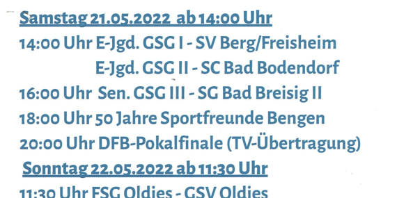 Endlich ist es soweit. Nach langer Corona-Pause findet nun das 5. Sportfest der Sportfreunde Bengen 1971 e.V. statt. Hierzu laden wir Sie herzlich zum Sportwochenende vom 20.05.2022-22.05.2022 auf den Sportplatz in Bengen ein.
